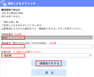 4. 表示されている氏名が患者さんであることを確認する。電話番号と診察内容を入力し、「順番取りをする」をクリック